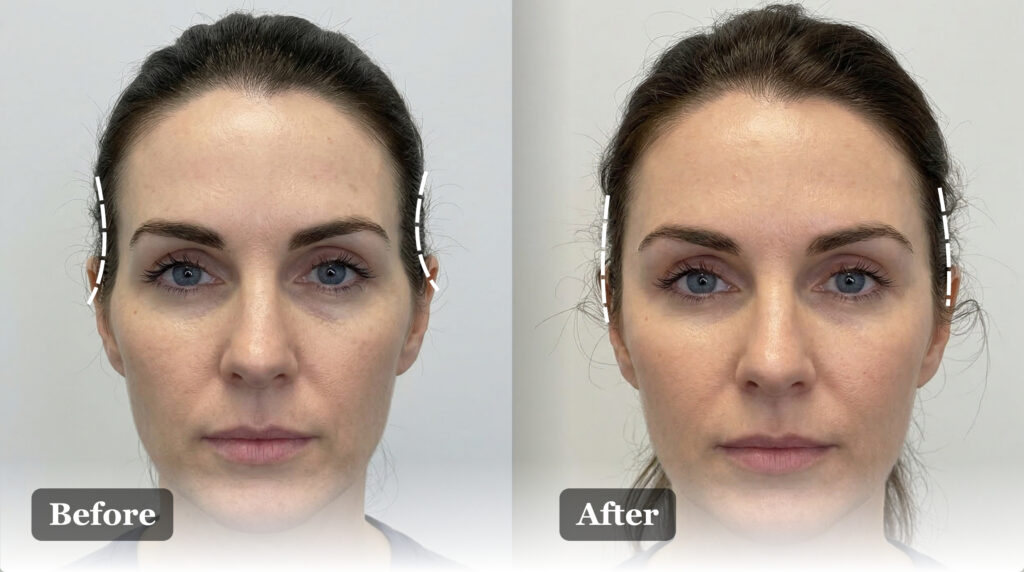 At our clinic, we use carefully selected Hyaluronic Acid (HA) fillers for temple and forehead correction. Hyaluronic Acid is a naturally occurring substance in the body that attracts and retains moisture. Because HA fillers are moldable, precise, and reversible, they are often preferred for advanced facial contouring where subtlety and safety are essential.